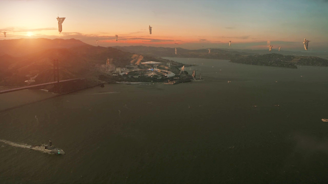 VEduta aerea della baia di San Francisco, della Accademia della Flotta Stellare e della USS Athena NCC-392023 a terra nel 3191.